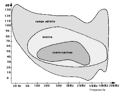 La linea che delimita inferiormente la superficie relativa all'intero campo sonoro rappresenta la soglia di udibilità media umana, (i suoni che giacciono al di sotto di questa linea non sono mediamente percepibili).